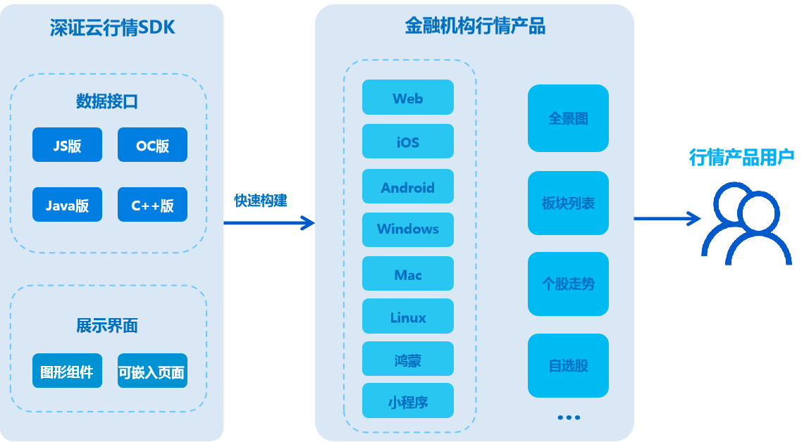 深證云行情SDK提供數(shù)據(jù)接口以及展示界面兩種服務(wù)形式,數(shù)據(jù)接口包括安卓、蘋果、Windows平臺(tái)的原生語言接口,以及跨平臺(tái)的JavaScript接口,支持金融機(jī)構(gòu)的產(chǎn)品訂閱獲取行情數(shù)據(jù);展示界面包括跨平臺(tái)的圖形組件、可嵌入的Html5頁面,支持金融機(jī)構(gòu)以最小開發(fā)量提供行情服務(wù)。