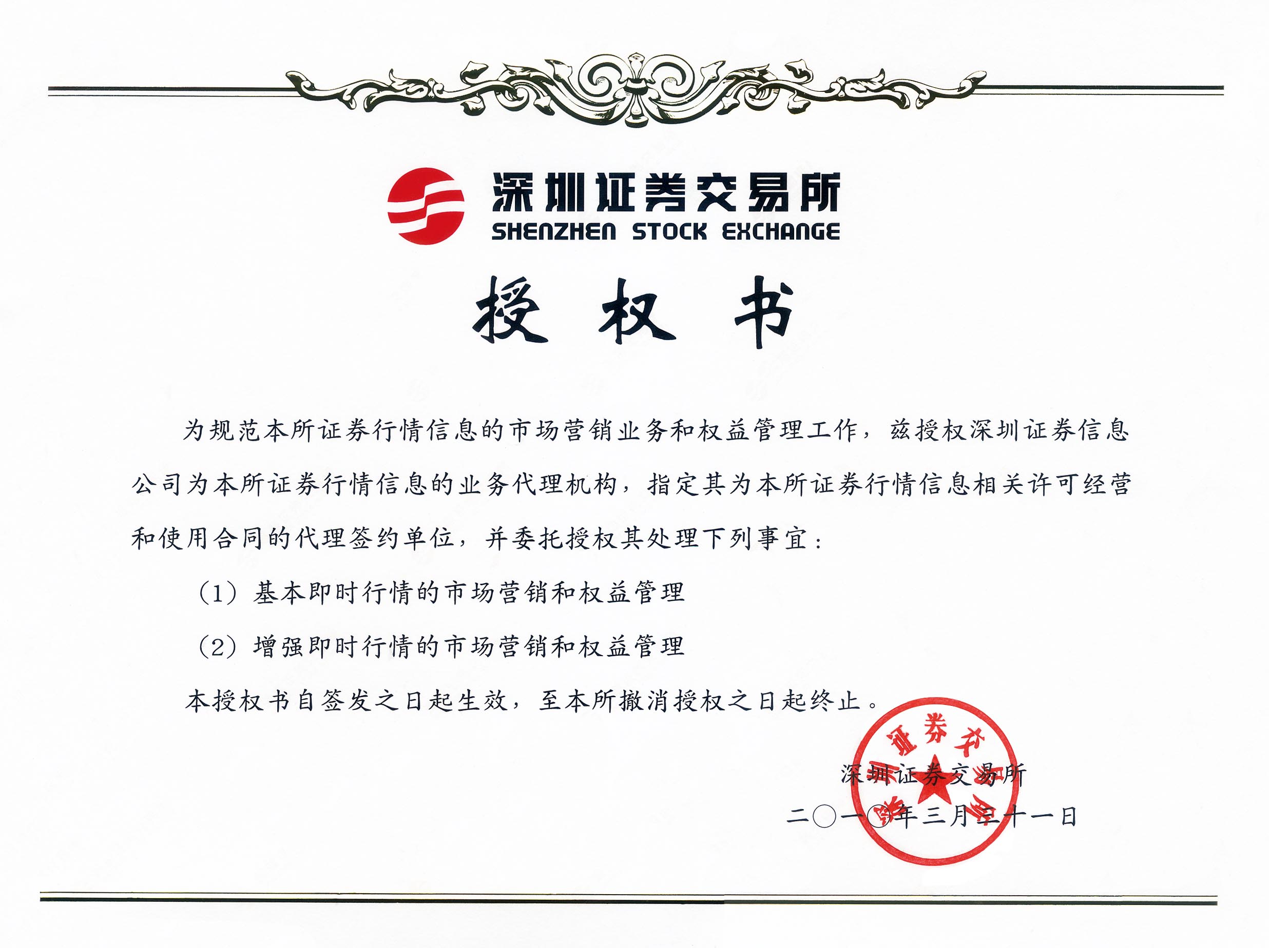 深圳證券信息有限公司經深圳證券交易所獨家授權,全權代表深交所經營深市行情信息, 負責深交所行情境內外授權使用工作。